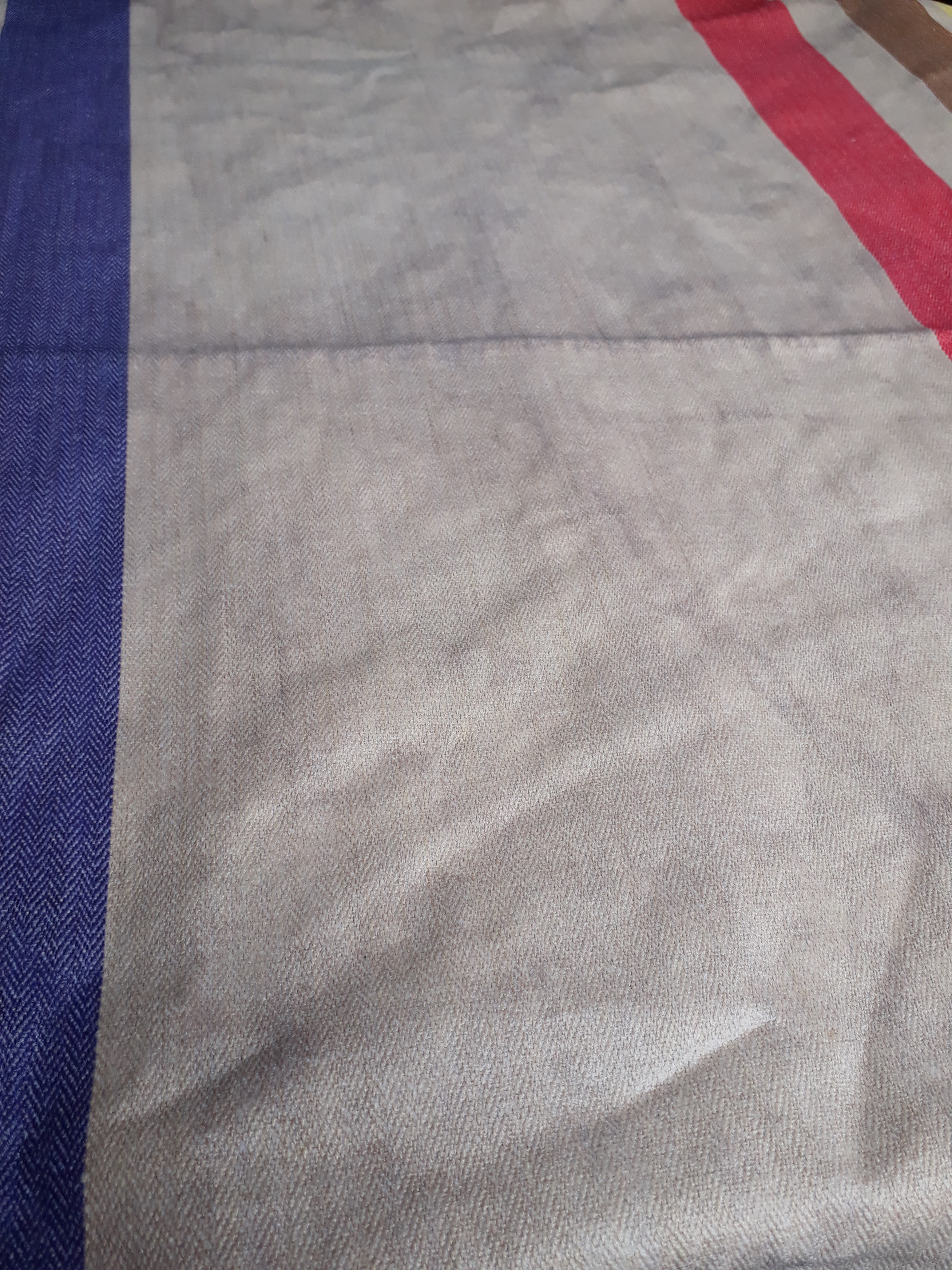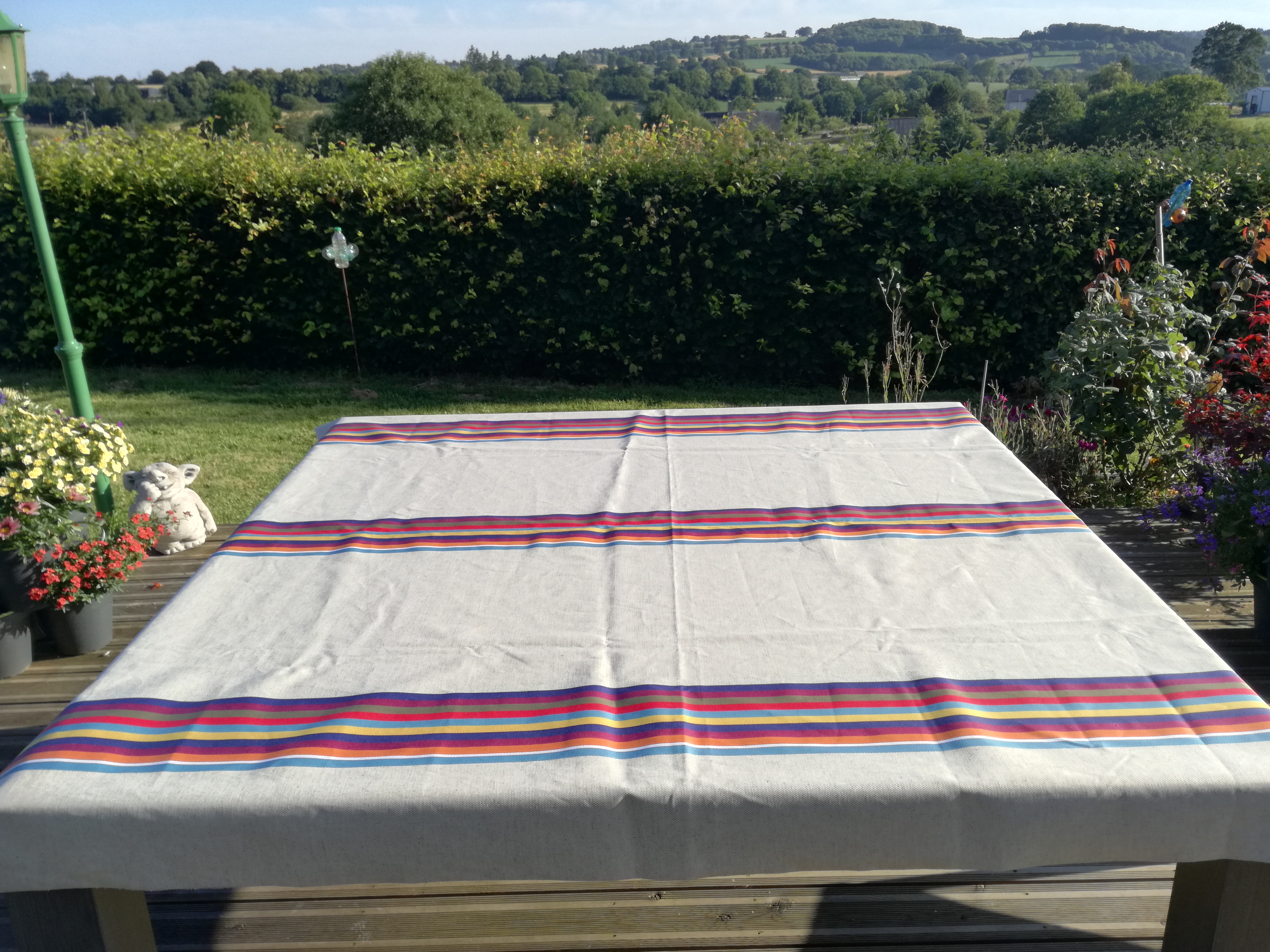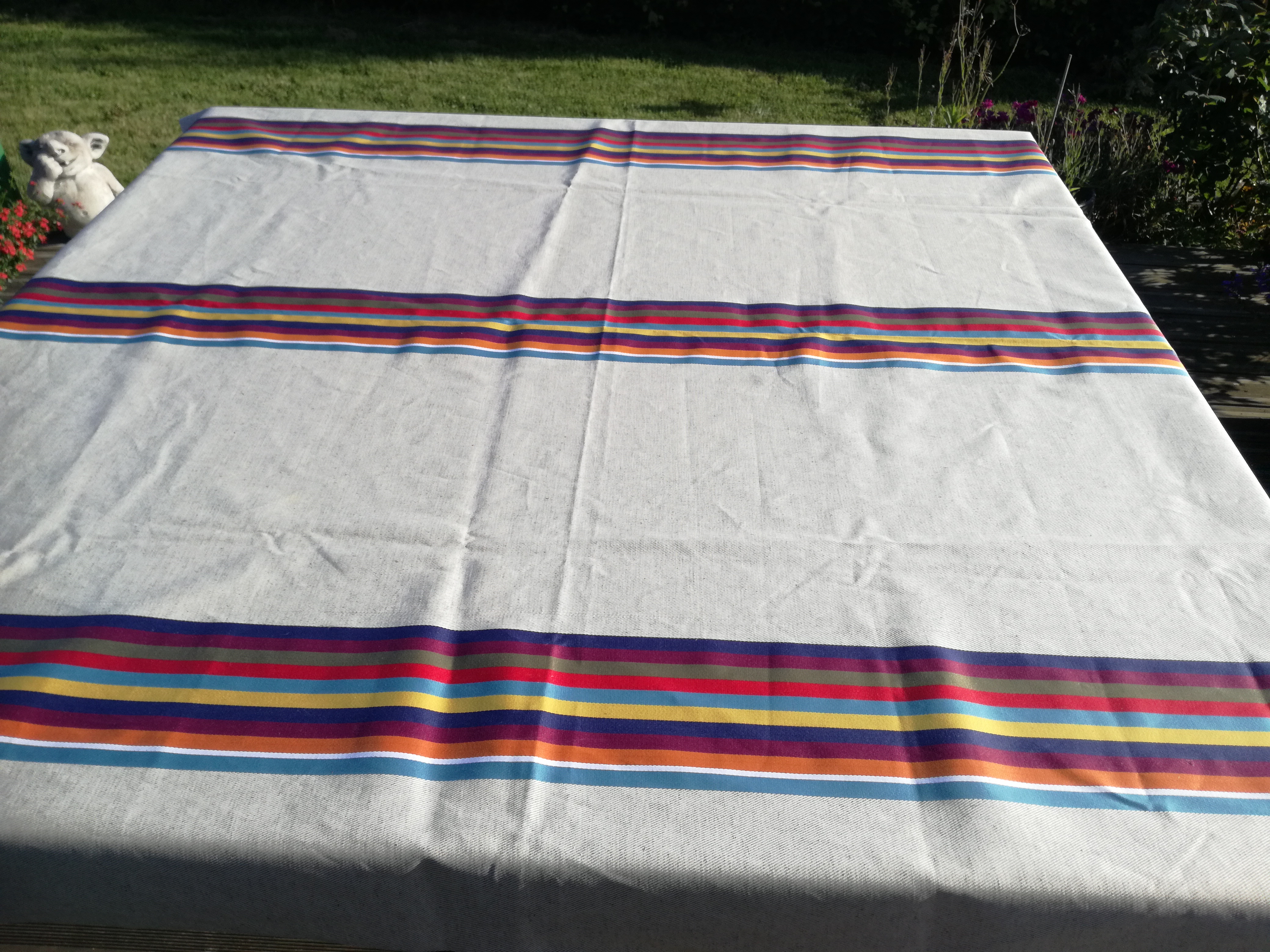 Très belle nappe achetée lors de nos dernieres vacances d été avec coussins en septembre 2019, je l ai etrennée ce we et l ai passée ce matin à la machine à laver programme 15 mnts à 30* et voici le resultat ...les bandes ont déteint!! N y a t il pas un problème?😣 Très décue!!
