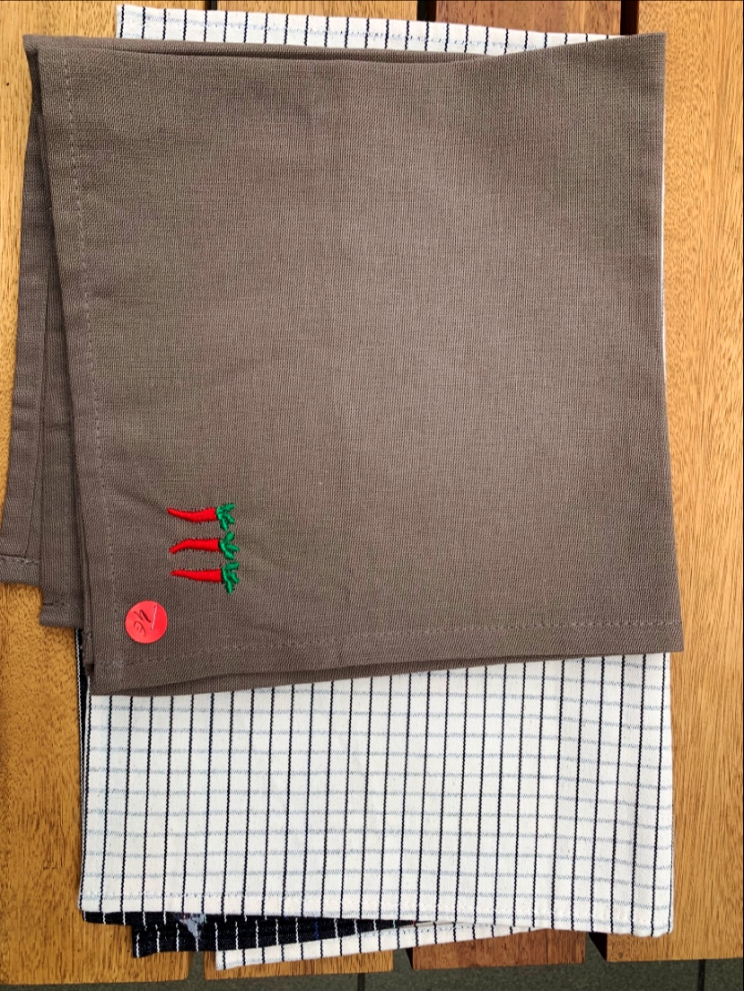 Bonjour Madame, en effet, ceux sont nous pensons, des torchons sérigraphiés ( petits piments) de très anciennes collections, mélangés aux 99% de nos créations, productions et confections Françaises. Au plaisir de vous accueillir une prochaine fois. Salutations