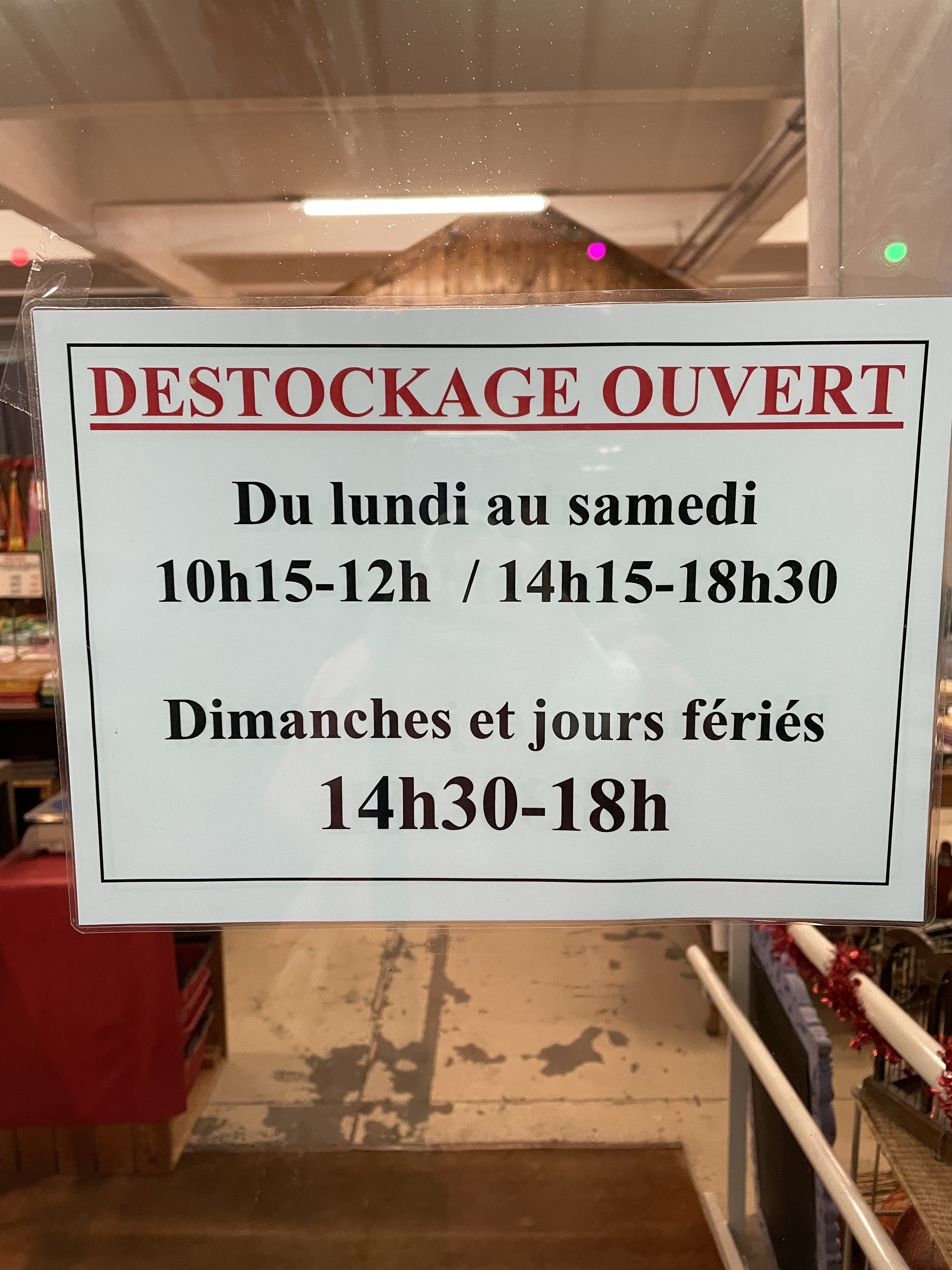 Deux boutiques à quelques mètres : le magasin d’usine et la braderie. Je n’ai testé que la braderie et je suis enchantée : bel accueil, vendeuses sympathiques et disponibles, pas mal de choix pour tous les budgets, et même un vide-grenier vaisselle et objets de décoration. Horaires sur la photo. J’y retournerai avec plaisir.